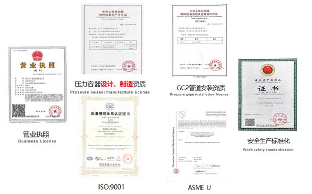 A2壓力容器制造許可證,D1/D2壓力容器設計許可證;GC2管道安裝許可證;ASME U/NB鋼印;ISO9001、ISO45001、ISO14001體系認證證書等。